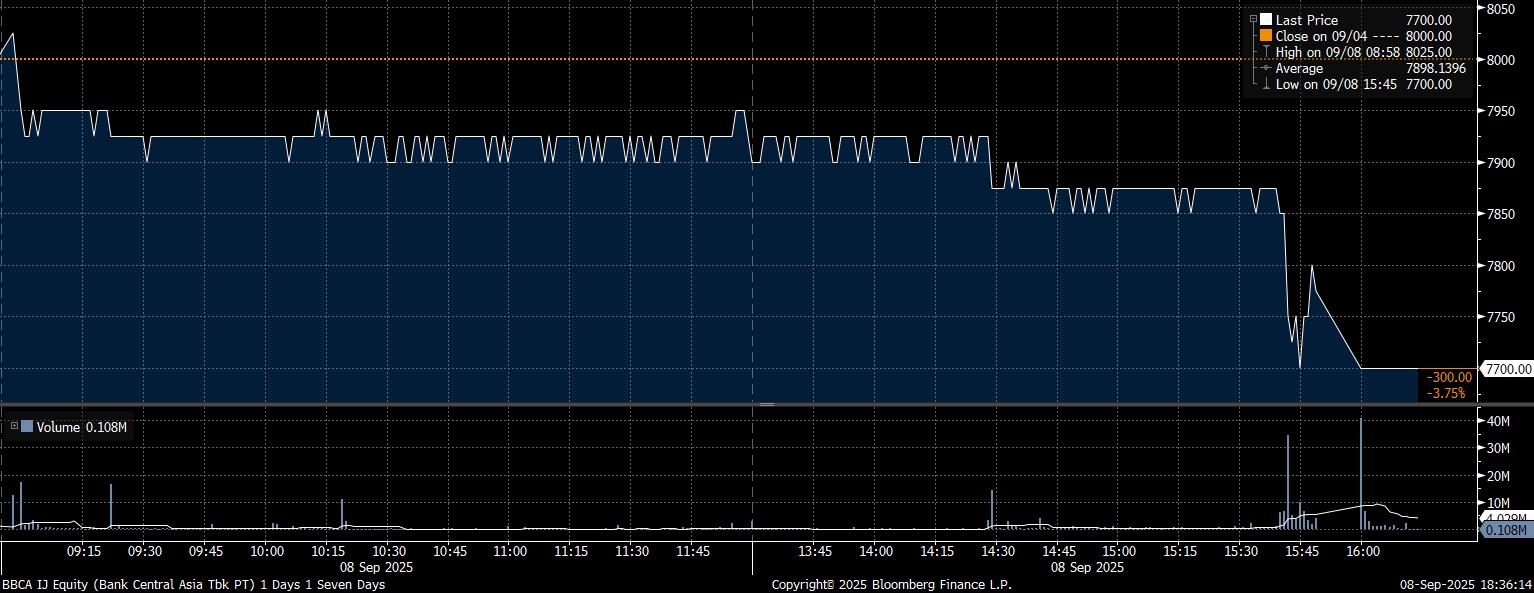 Adapun investor asing net sell besar pada saham PT Bank Central Asia Tbk (BBCA) mencapai Rp1,24 triliun. Imbas tekanan jual yang masif, saham BBCA melemah 3,75% di posisi Rp7.700/saham.