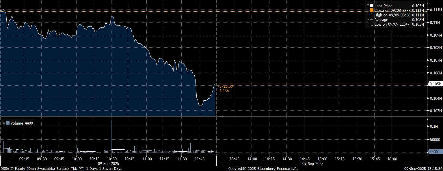 Saham DSSA ditutup melemah 5.725 poin atau dengan kehilangan 5,16% ke level Rp105.125/saham dengan sebanyak 1 juta saham ditransaksikan dengan nilai Rp119 miliar.