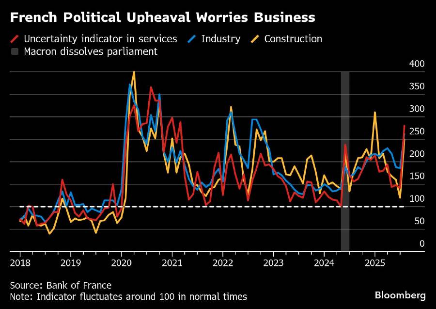 Namun, survei Bank of France yang dilakukan menjelang pengumuman mosi tak percaya Bayrou menunjukkan peningkatan tajam ketidakpastian di kalangan pemimpin bisnis, sebanding dengan lonjakan yang terjadi setelah Macron membubarkan parlemen.