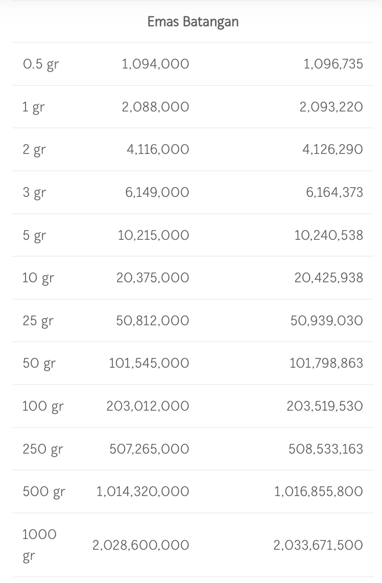 Berikut daftar harga emas Logam Mulia Antam selengkapnya untuk hari ini: