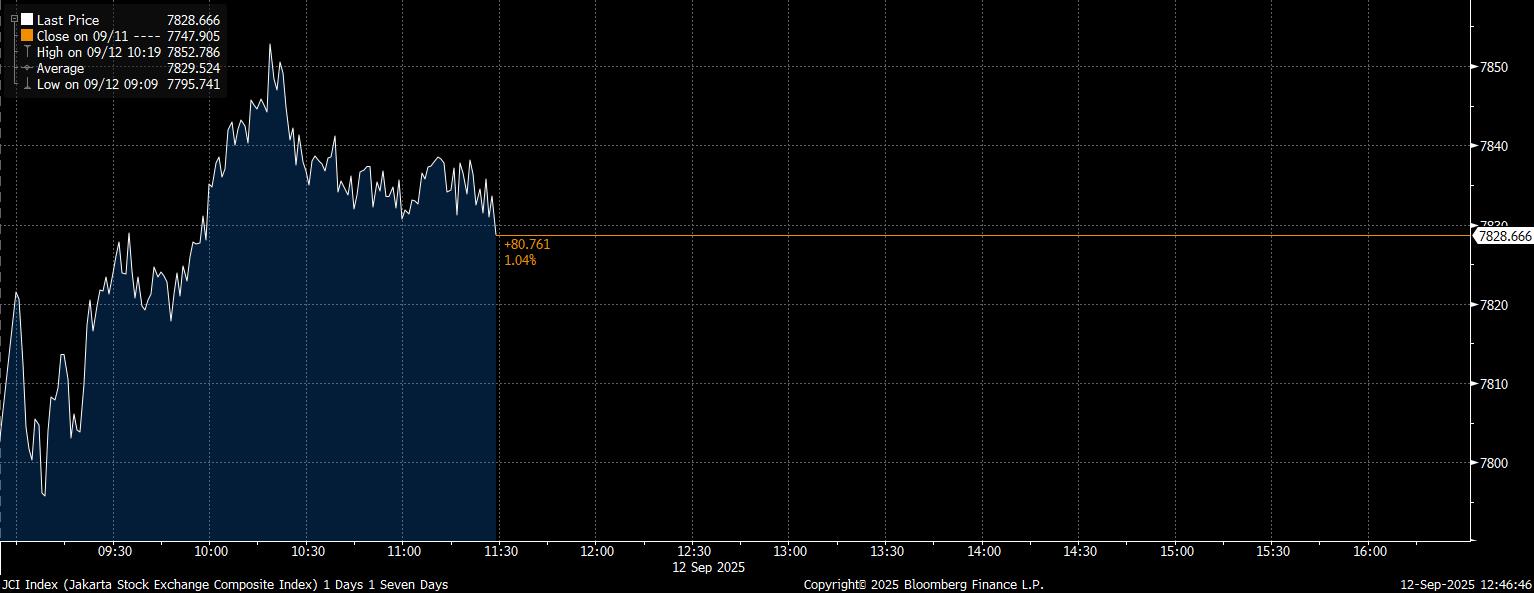 Bloomberg Technoz, Jakarta - Indeks Harga Saham Gabungan (IHSG) pada jeda perdagangan Sesi I Jumat (12/9/2025), berhasil ditutup di zona hijau dengan kenaikan 1,04% di posisi 7.828,66 yang didorong hingga ditopang oleh saham–saham teknologi.