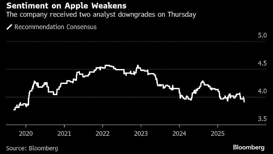Dengan penurunan peringkat tersebut, konsensus rekomendasi Apple — sebagai indikator rasio antara rekomendasi Buy, Hold, dan Sell — turun menjadi 3,9 dari 5, level terendah sejak awal 2020, menurut data yang dihimpun oleh Bloomberg.