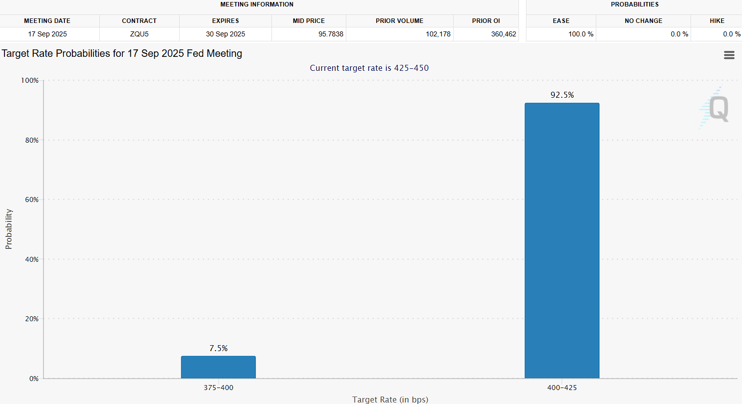 Mengutip CME FedWatch, peluang penurunan Federal Funds Rate sebesar 25 basis poin menjadi 4–4,25% dalam rapat September adalah 92,5%. Terlebih lagi ada kemungkinan penurunan mencapai 50 bps ke 3,75–4%, peluangnya 7,5%.