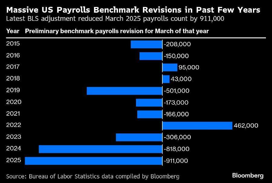 Pertumbuhan lapangan kerja AS jauh lebih lemah pada periode hingga Maret dibandingkan laporan sebelumnya, menambah tekanan pada The Fed untuk menurunkan suku bunga. Jumlah pekerja dalam daftar penggajian diperkirakan akan direvisi turun sebesar 911.000, atau 0,6%, menurut revisi awal pemerintah.