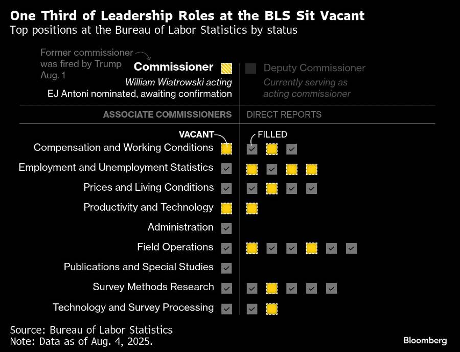 Menurut situs webnya, sepertiga jabatan tingkat tinggi di Biro Statistik Tenaga Kerja (BLS)—yang menerbitkan data-data penting tentang lapangan kerja dan inflasi AS—kosong. Meski posisi komisioner telah diisi sementara, sejumlah posisi pemimpin lain yang mengawasi berbagai aspek statistik tenaga kerja dan operasi lapangan regional masih kosong.