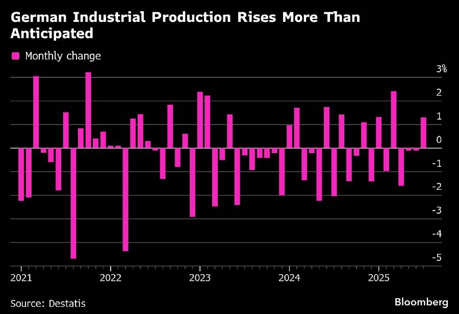 Produksi industri Jerman naik lebih dari perkiraan pada Juli, memberikan sedikit harapan bahwa sektor utama negara tersebut mungkin mulai stabil dan segera mengatasi kemerosotan yang telah berlangsung bertahun-tahun.
