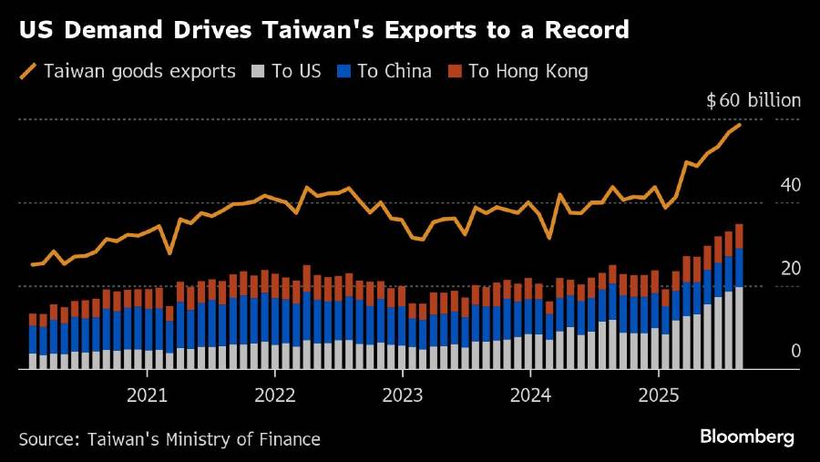 Ekspor Taiwan tumbuh lebih dari perkiraan, mencapai rekor bulanan sebesar US$58,5 miliar, menunjukkan permintaan barang-barang teknologi negara kepulauan itu kuat meski ada tarif baru AS.