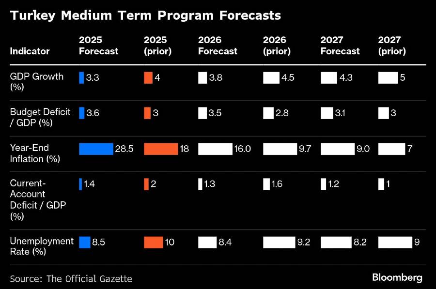 Turki memangkas proyeksi produk domestik bruto (PDB), menandakan pemerintah memprioritaskan stabilitas harga daripada pertumbuhan cepat. Program Jangka Menengah baru pemerintah yang diumumkan pada Minggu malam memperkirakan ekonomi tumbuh 3,3% tahun ini dan 3,8% tahun depan, turun dari proyeksi sebelumnya sebesar 4% dan 4,5%.