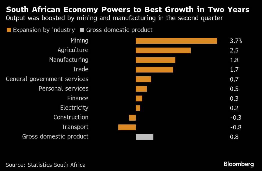 Ekonomi Afrika Selatan tumbuh dengan laju tercepat dalam dua tahun pada kuartal kedua, didorong oleh pemulihan kuat di sektor manufaktur dan pertambangan. Produksi pertambangan tumbuh 3,7%, laju tercepat sejak kuartal I-2021. Kepala Statistik Risenga Maluleke mengatakan logam jenis platinum, emas, dan bijih kromium sebagai kontributor utama.