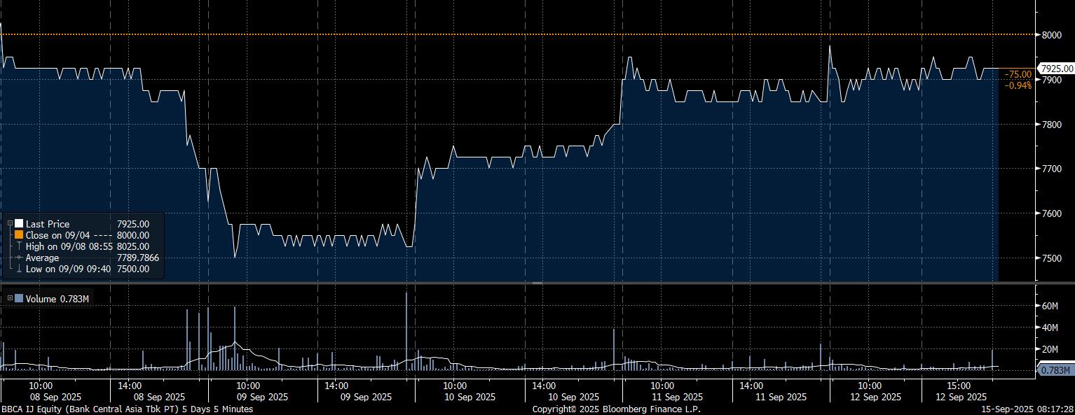 Adapun investor asing mencatat net sell tertinggi pada saham PT Bank Central Asia Tbk (BBCA) mencapai Rp3,78 triliun. Imbas tekanan jual investor asing, saham BBCA melemah 0,94% dalam sepekan di posisi Rp7.925/saham.