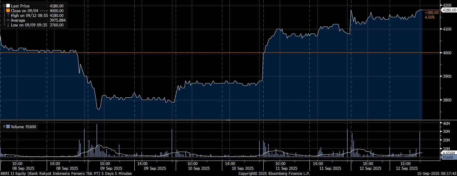Pada kesempatan yang sama, investor asing tercatat net buy saham terbanyak pada emiten PT Bank Rakyat Indonesia Tbk (BBRI) mencapai Rp292,63 miliar. Sejalan dengan tren pembelian yang signifikan, saham BBRI menguat 4,5% dalam sepekan ke posisi Rp4.180/saham.