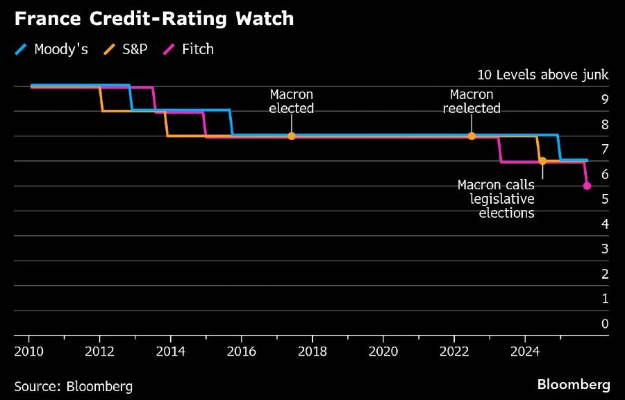 Bloomberg, Fitch Ratings menurunkan peringkat Prancis, mengindikasikan bahwa gejolak keruntuhan pemerintahan yang berulang menjebak negara ini dalam perjuangan panjang untuk mengendalikan beban utang yang terus bengkak.
