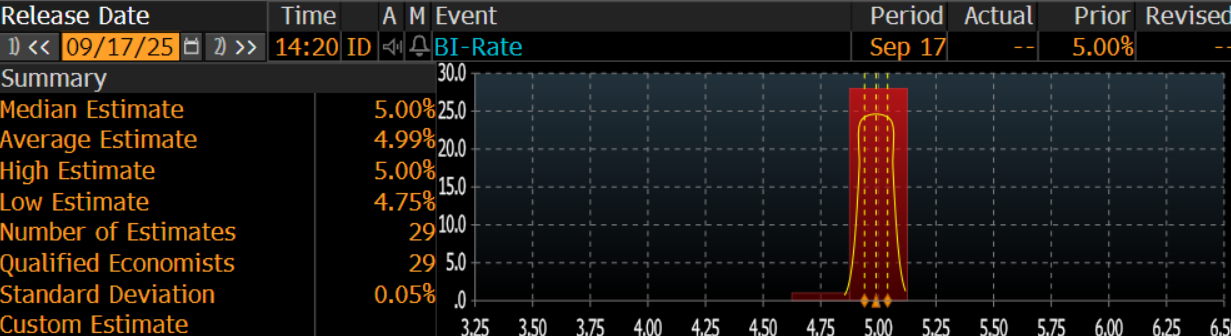 Konsensus pasar dari 29 ekonom/analis yang dihimpun Bloomberg sampai dengan siang hari ini mengestimasikan bunga acuan BI Rate akan ditahan di 5%.