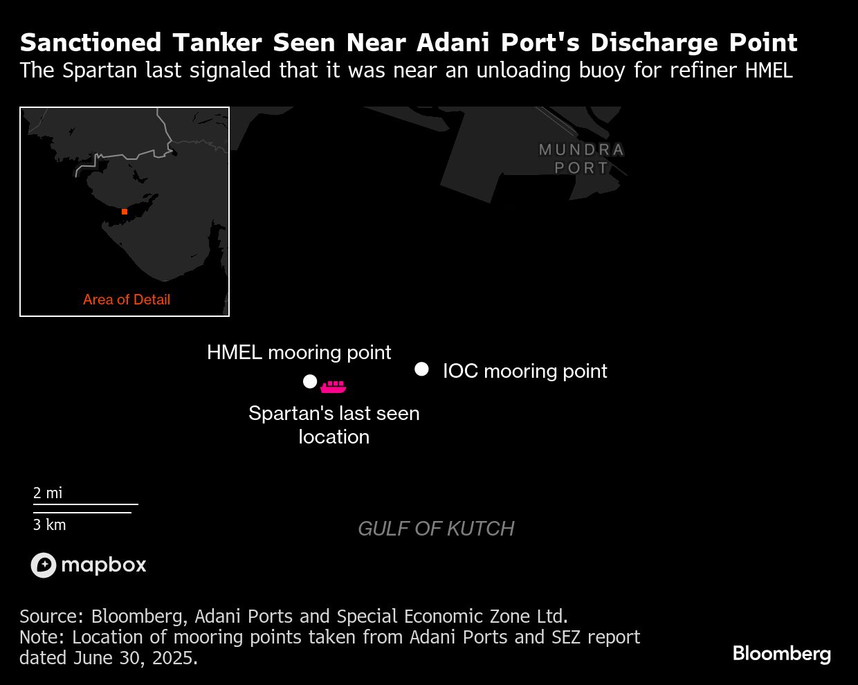 Spartan, sebuah kapal Suezmax yang membawa sekitar 1 juta barel minyak mentah Urals, berada di lepas pantai Pelabuhan Mundra pada Minggu (14/9/2025) di dekat titik pembuangan lepas pantai yang melayani kilang HPCL-Mittal Energy Ltd., menurut data pelacakan kapal yang dikumpulkan oleh Bloomberg, Kpler, dan Vortexa.