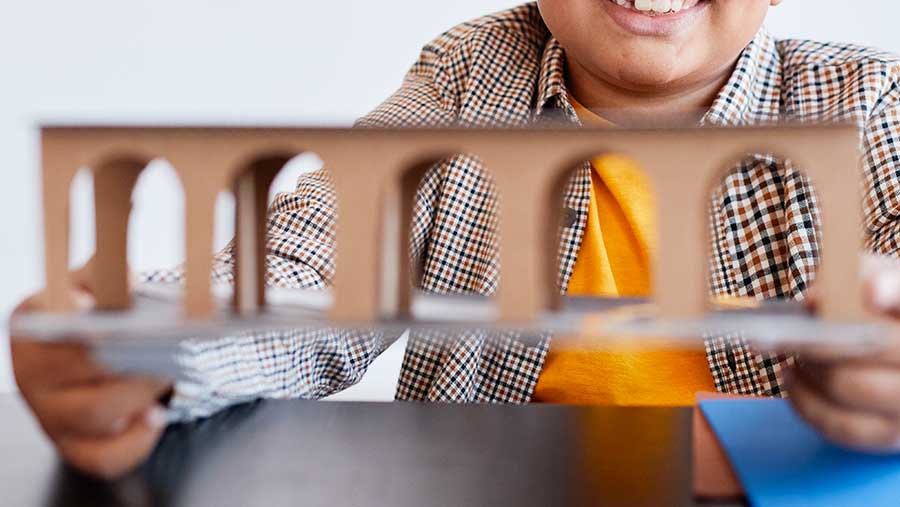 Tantang anak membuat jembatan dari selembar kertas yang dapat menopang beban. Anak akan belajar bahwa dengan melipat kertas atau memberi bentuk khusus, kekuatan kertas bisa meningkat. Ini memperkenalkan prinsip dasar arsitektur.