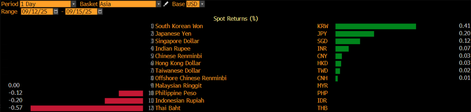 Di sisi berseberangan, won Korea berhasil memimpin penguatan 0,41%, bersama yen Jepang yang terapresiasi 0,2%, lalu dolar Singapura 0,12%, rupee India 0,07%, yuan China 0,03%, dolar Hong Kong 0,03%, dan dolar Taiwan menguat 0,02%.