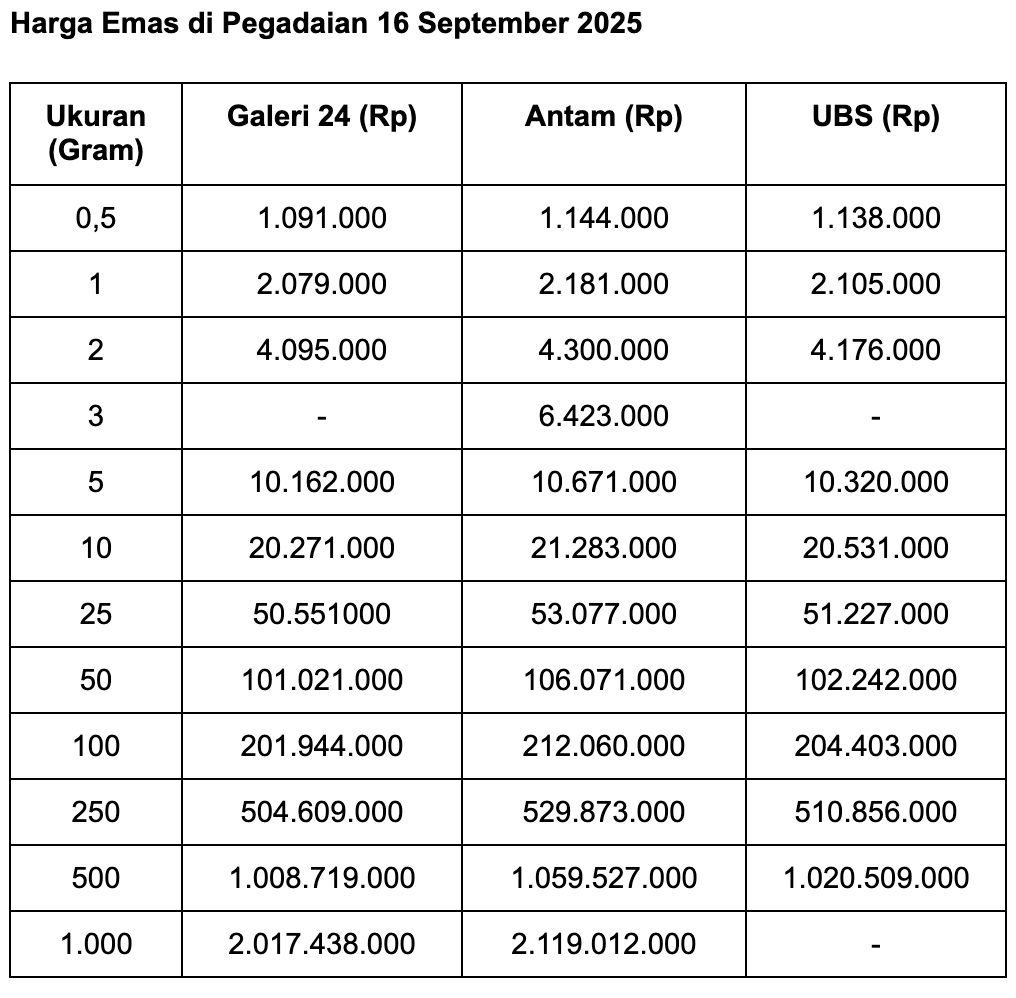 Pada Senin (15/9/2025), harga emas batangan cetakan PT Aneka Tambang (Persero) Tbk (ANTM) untuk ukuran terkecil 0,5 gram di Pegadaian adalah Rp 1.145.000. Sementara untuk ukuran 1 gram, harga emas Antam di Pegadaian adalah Rp 2.183.000.