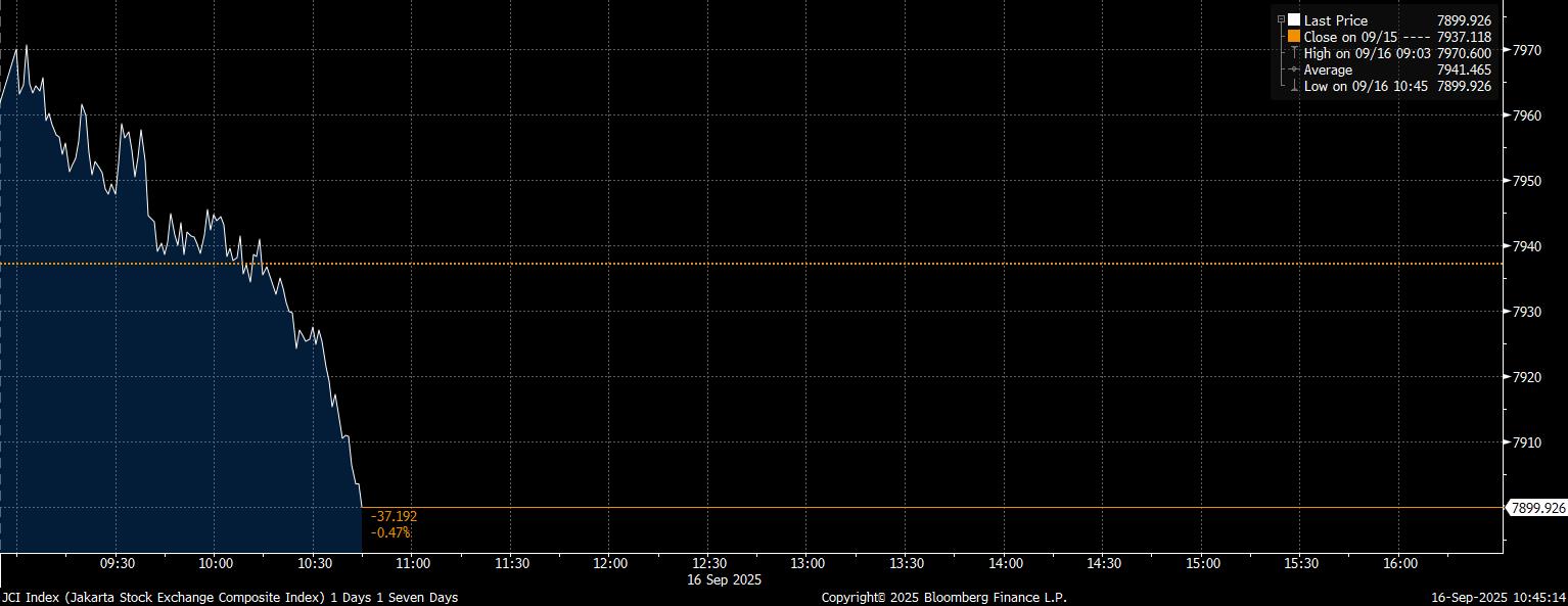 Bloomberg Technoz, Jakarta - Indeks Harga Saham Gabungan (IHSG) balik arah pada Sesi I hingga terpeleset di zona merah dengan tertekan 0,47% dan kehilangan 37,19 poin ke level 7.899,9 pada perdagangan Selasa (16/9/2025). Saham DCII jadi salah satu penyebab.