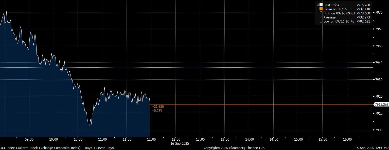 Bloomberg Technoz, Jakarta - Indeks Harga Saham Gabungan (IHSG) menutup perdagangan Sesi I di zona merah. IHSG melemah 21,85 poin atau memerah 0,28% ke level 7.915,26 pada Selasa (16/9/2025). Saham MAPA, BBTN, hingga GOTO jadi pemberat.