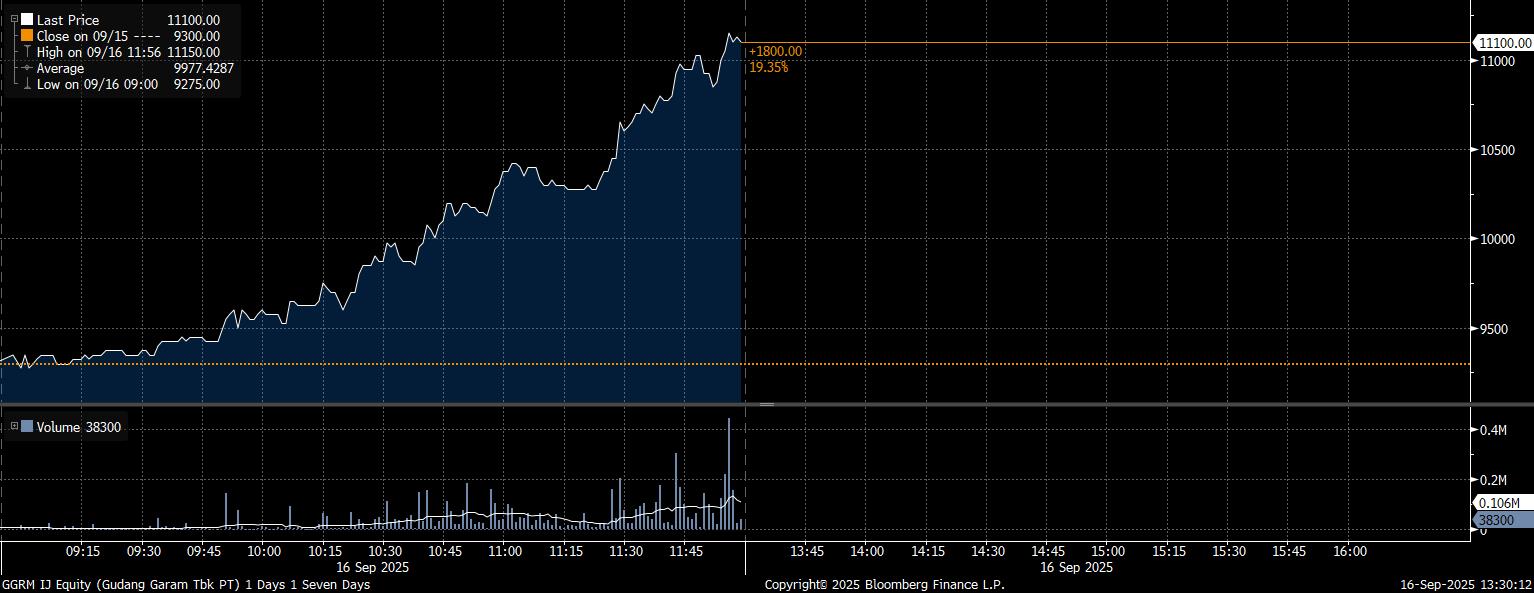 Bloomberg Technoz, Jakarta - Sentimen soal cukai mengatrol harga saham emiten rokok sepanjang perdagangan saham hari ini, Selasa (16/9/2025).