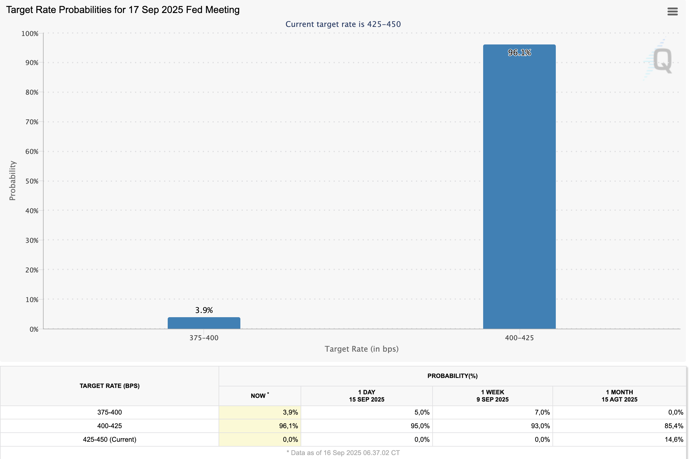 Mengutip CME FedWatch, peluang penurunan Federal Funds Rate sebesar 25 basis poin (bps) ke 4-4,24% adalah 96,1%. Sementara kemungkinan pemangkasan 50 bps menjadi 3,75-4% adalah 3,9%. Tidak ada probabilitas suku bunga acuan bakal ditahan di 4,25-4,5%.