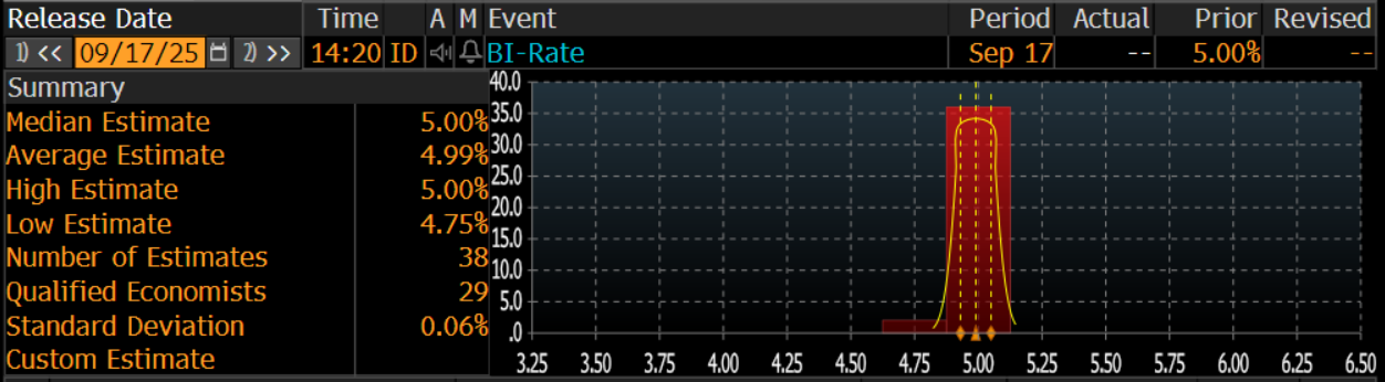 Mengacu konsensus yang dihelat oleh Bloomberg, sebanyak 36 dari 38 ekonom/analis yang disurvei, mengestimasikan BI Rate akan tetap di 5%. Namun, dua orang di antaranya masih memprediksi BI Rate berpeluang dipangkas 25 bps menjadi 4,75%.