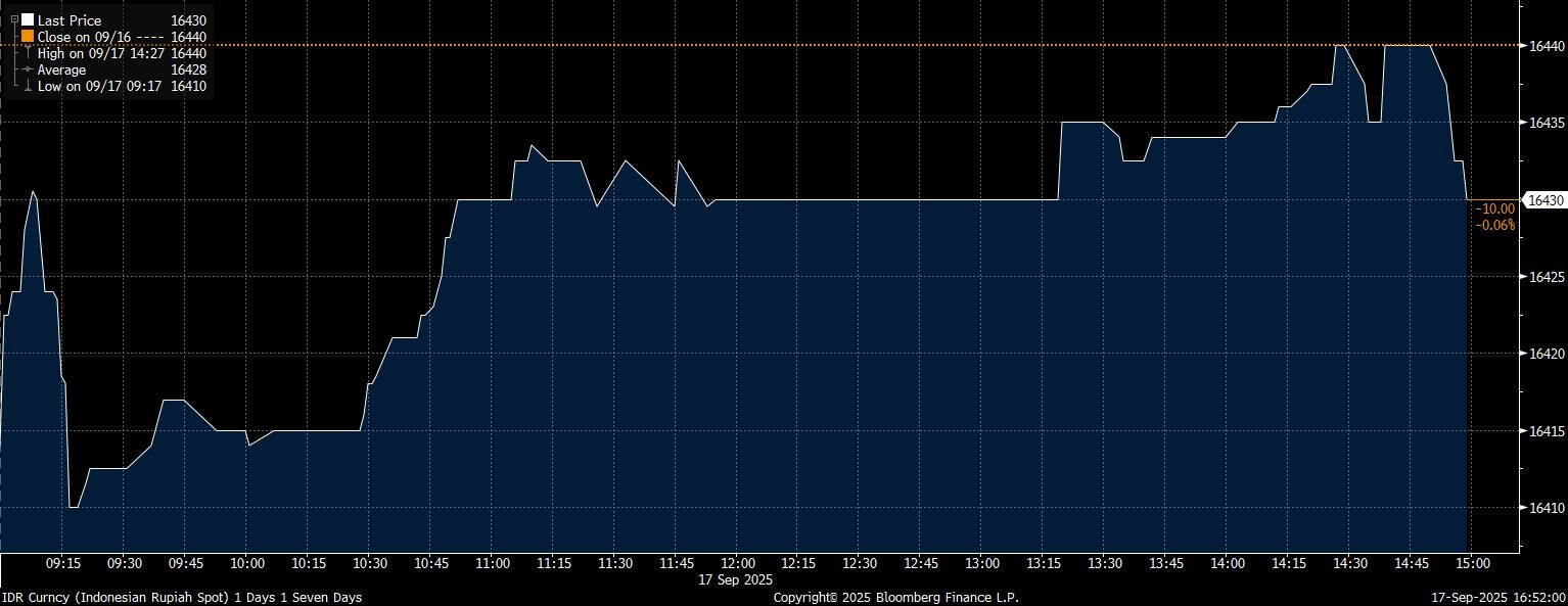 Penguatan IHSG sejalan dengan solidnya mata uang Indonesia rupiah hari ini, Rabu (17/9/2025), di pasar spot ditutup di level Rp16.430/US$ pada penutupan perdagangan.