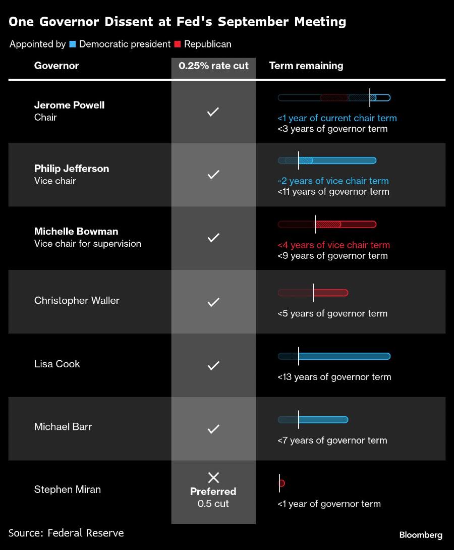 Gubernur Fed Lisa Cook dan Gubernur Stephen Miran (baru dilantik), yang sedang cuti sementara dari jabatannya sebagai ketua Dewan Penasihat Ekonomi Gedung Putih, keduanya menghadiri pertemuan tersebut.