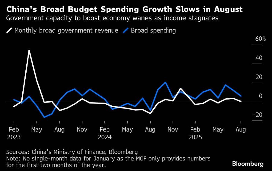 Menurut perhitungan Bloomberg berdasarkan data yang diterbitkan Kementerian Keuangan (Kemenkeu) pada Rabu, total pengeluaran dalam dua buku anggaran fiskal utama China hanya naik 6% bulan lalu dibandingkan tahun sebelumnya—laju terendah sejak Mei—menjadi 2,7 triliun yuan (US$380 miliar).