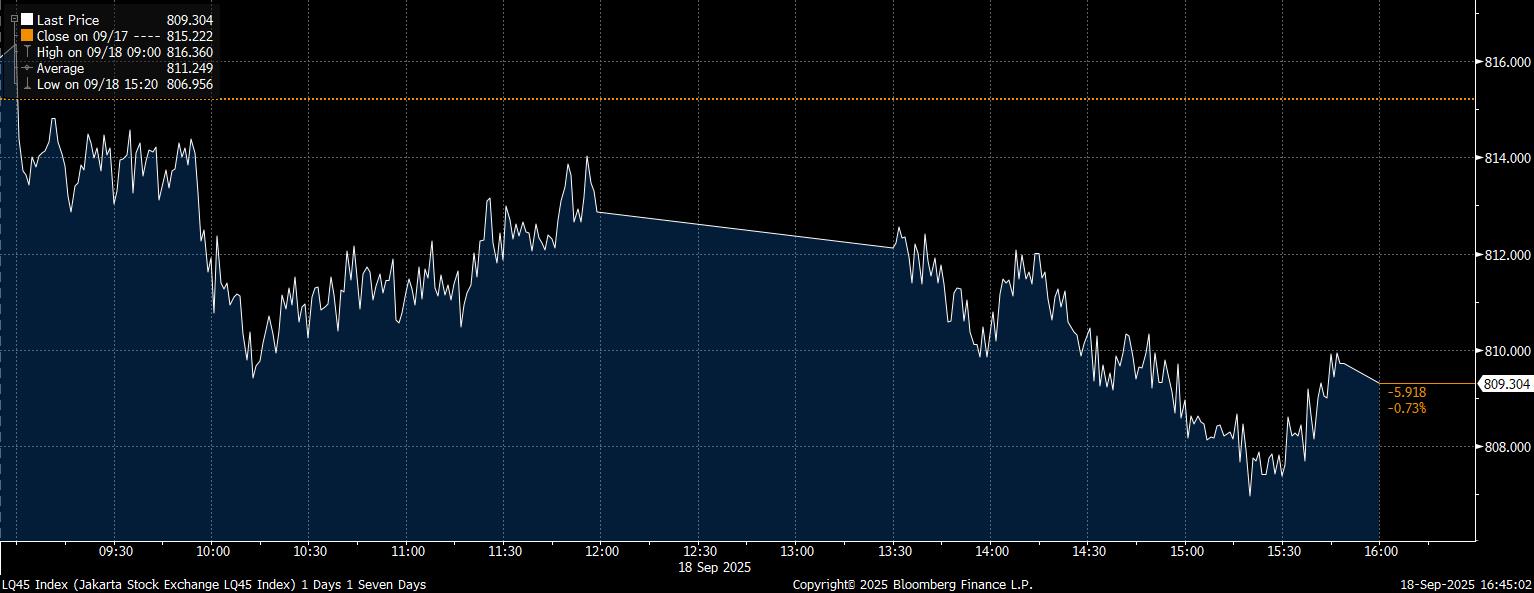 Hingga penutupan perdagangan, indeks LQ45 yang berisikan saham–saham Big Caps tercatat melemah mencapai 0,73% dan 5,19 poin ke level 809,3.