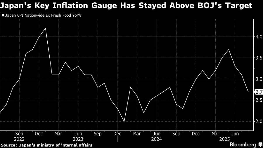 Kementerian Dalam Negeri dan Komunikasi melaporkan pada Jumat bahwa indeks harga konsumen (IHK), tak termasuk makanan segar, naik 2,7% dibandingkan tahun sebelumnya pada Agustus, melambat dari kenaikan 3,1% pada bulan sebelumnya.