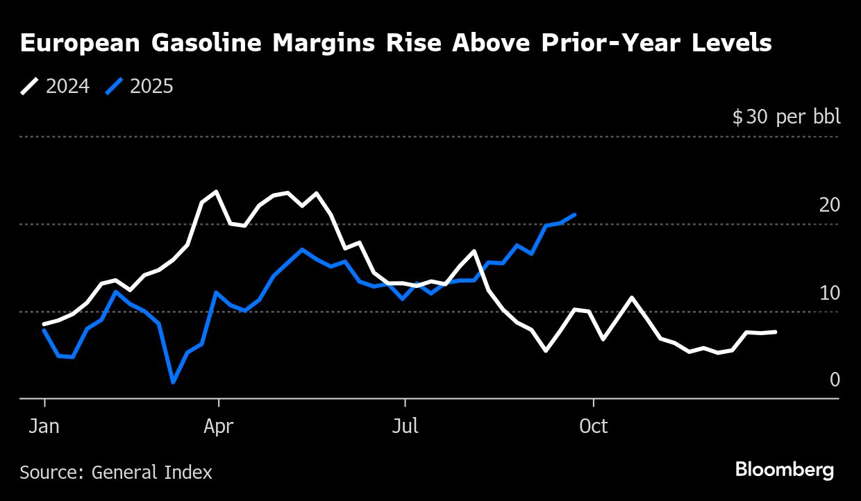 Di Eropa barat laut, premi bensin terhadap minyak mentah tercatat sangat kuat untuk periode ini, menurut data General Index.