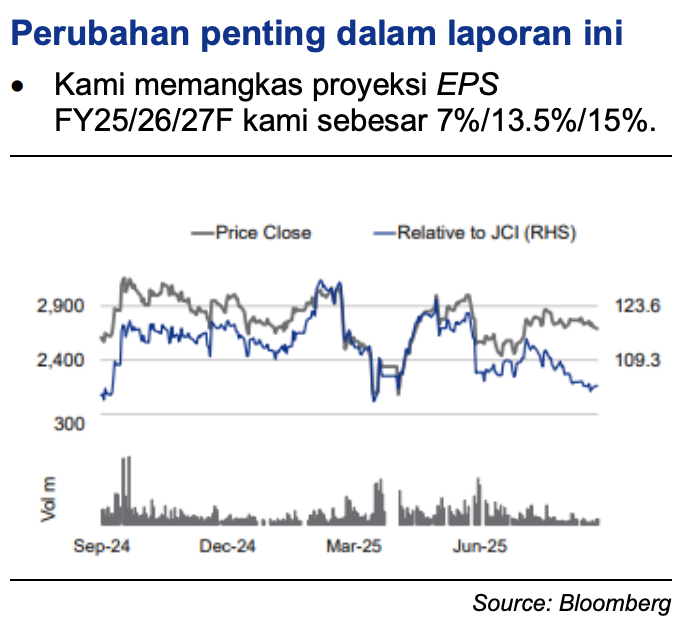 “Target harga baru kami yang lebih rendah sebesar Rp 3.100 berbasis GGM didasarkan pada 2,4x FY26F P/BV. Re-rating catalysts: pertumbuhan kredit yang lebih kuat dari perkiraan, dan efisiensi biaya operasional yang lebih baik. Downside risks: memburuknya kualitas kredit dan NIM,” tegas riset CGS.