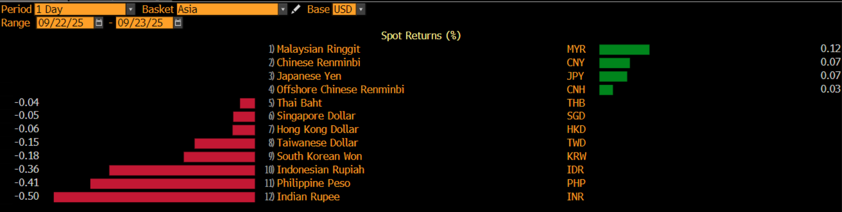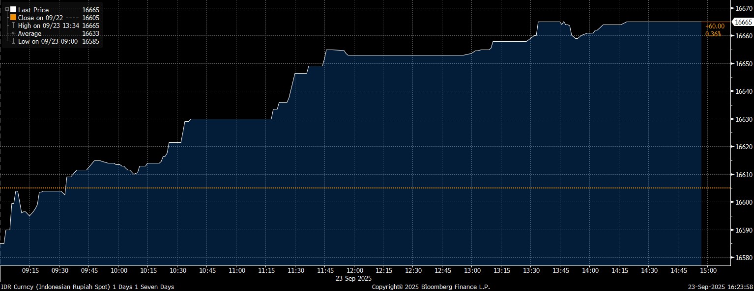 Rupiah spot ditutup melemah 0,36% di level Rp16.665/US$ seperti ditunjukkan data Bloomberg, Selasa (23/9/2025). Pelemahan rupiah terjadi bersama–sama dengan mata uang Asia lain.
