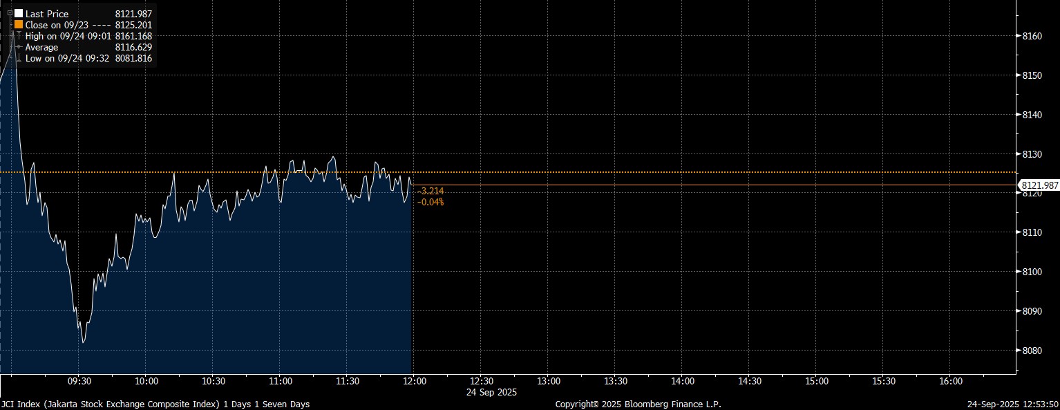 Bloomberg Technoz, Jakarta - Indeks Harga Saham Gabungan (IHSG) ditutup stagnan dengan turun tipis 0,04% di posisi 8.121 pada jeda penutupan Sesi I Rabu (24/9/2025) usai bergerak fluktuatif sejak pembukaan pagi hari tadi dengan saham Merdeka Copper Gold (MDKA) jadi pemberat IHSG.