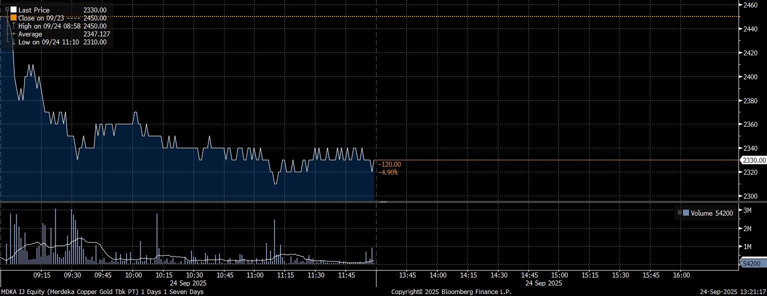 LQ45 yang berisikan saham-saham unggulan ikut tertekan hingga menjadi pemberat utama IHSG antara lain, saham PT Merdeka Copper Gold Tbk (MDKA) ambles 4,91%, dan saham PT Aneka Tambang Tbk (ANTM) dengan pelemahan 3,81%.