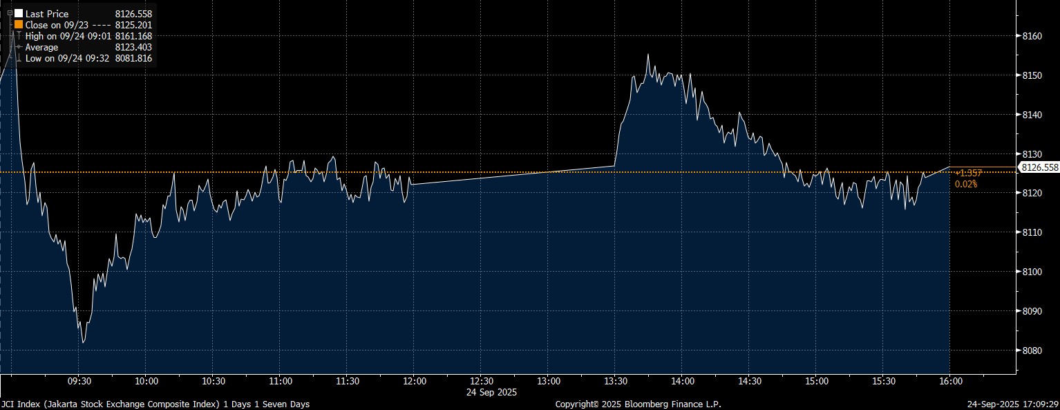 Bloomberg Technoz, Jakarta - Indeks Harga Saham Gabungan (IHSG) pada penutupan Sesi II Rabu (24/9/2025) berbalik arah dari kenaikan terbaiknya usai paparan Gubernur The Fed Jerome Powell. Hingga tutup perdagangan, IHSG flat, dan stagnan dengan kenaikan 0,02%) di posisi 8.126,55.
