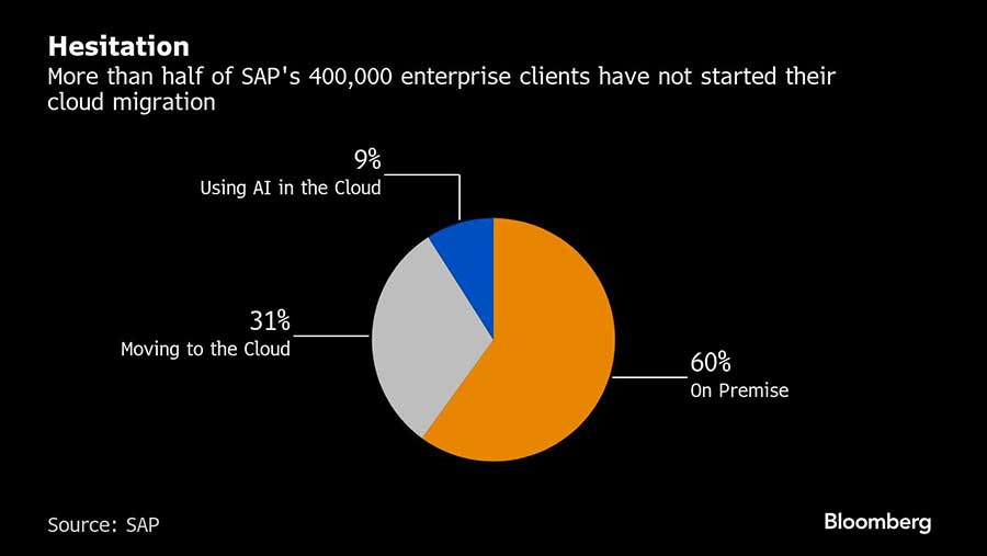 Untuk mempertahankan arah perkembangannya, SAP harus meyakinkan penggunanya guna membeli lebih banyak layanan dan produk AI baru. Namun, sebagian besar pelanggan masih dalam proses transisi ke cloud. Sekitar 60% di antaranya bahkan belum memulai sama sekali. Bagi perusahaan besar, migrasi ke cloud untuk sistem software yang kompleks dapat memakan waktu bertahun-tahun dan biaya jutaan dolar AS.
