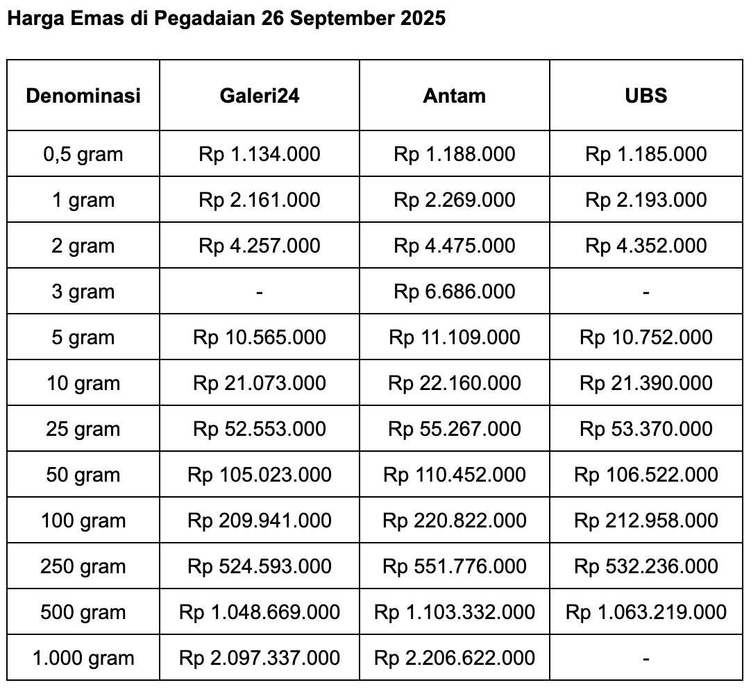 Adapun untuk ukuran 1 gram, harga emas Galeri 24 di Pegadaian adalah Rp 2.161.000. Dalam sehari, minus Rp 2.000.