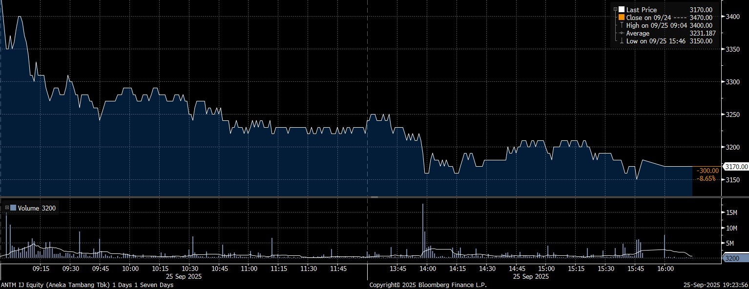 Adapun investor asing net sell yang masif pada saham PT Aneka Tambang Tbk (ANTM) mencapai Rp453,78 miliar. Pengaruh arus jual yang begitu deras, saham ANTM ambles 8,65% mencapai posisi Rp3.170/saham.