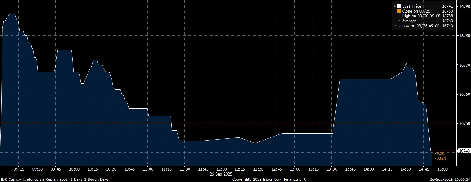 Rupiah spot pada perdagangan hari ini, Jumat (26/9/2025), ditutup menguat 0,05% di posisi Rp16.741/US$.