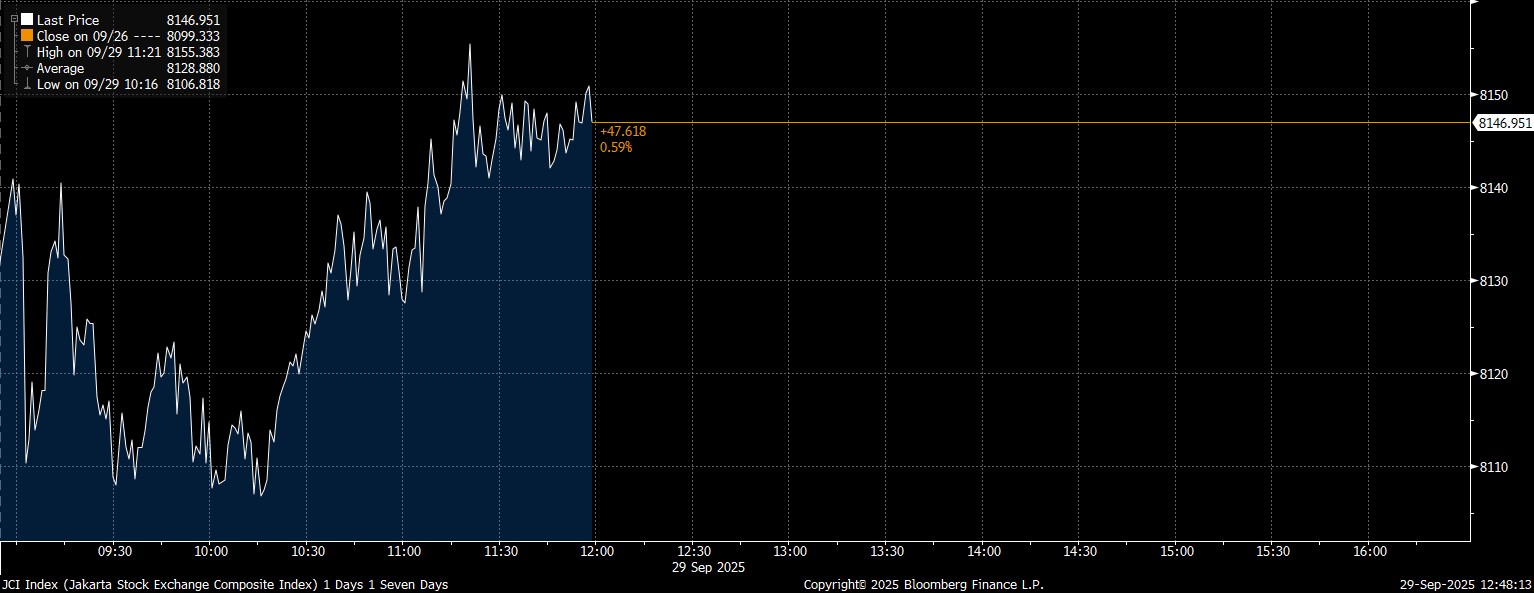 Pada Senin (29/9/2025), IHSG ditutup di posisi 8.146,95 pada Sesi I tengah hari. Menguat 0,59% dibanding hari sebelumnya.