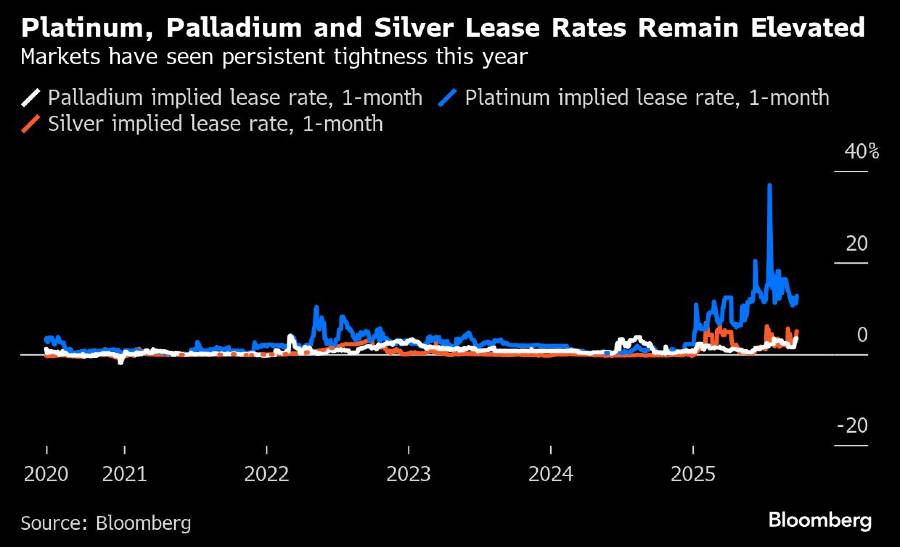 Suku bunga pinjaman—yang mencerminkan biaya pinjaman logam, umumnya untuk jangka pendek—untuk perak, platinum, dan palladium semuanya melonjak jauh di atas level normalnya yang mendekati nol.