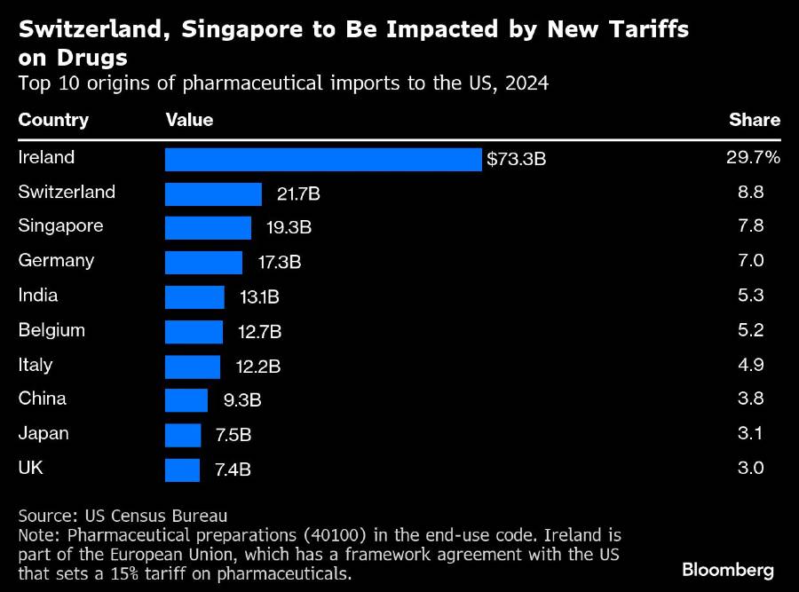 Pajak obat-obatan bermerek akan meningkatkan rata-rata tarif AS hingga 3,3 poin persentase, menurut Bloomberg Economics, meski dampaknya bisa diimbangi oleh pengecualian bagi perusahaan yang membangun fasilitas manufaktur lokal. Singapura dan Swiss merupakan negara yang paling terdampak oleh kebijakan ini.
