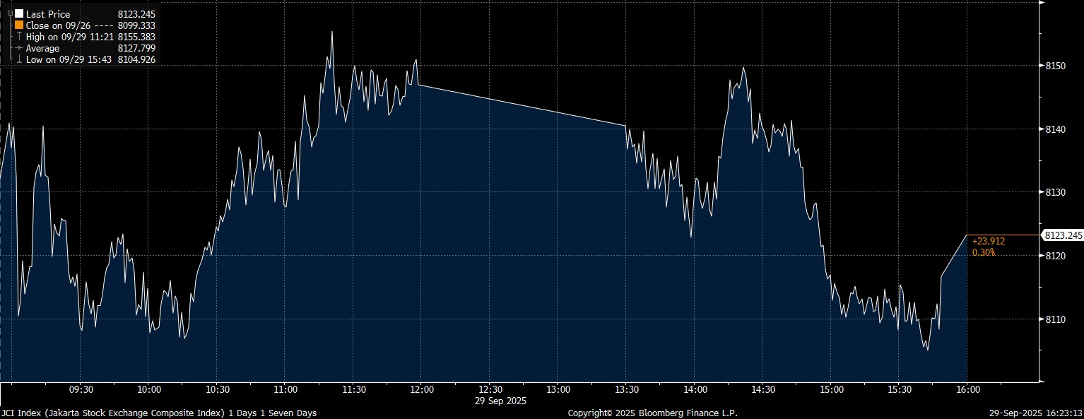 Bloomberg Technoz, Jakarta - Indeks Harga Saham Gabungan (IHSG) ditutup menguat di zona hijau dengan kenaikan 0,3% di posisi 8.123,24 pada perdagangan Senin (29/9/2025) dipicu oleh saham Prajogo Pangestu yang melaju kencang.