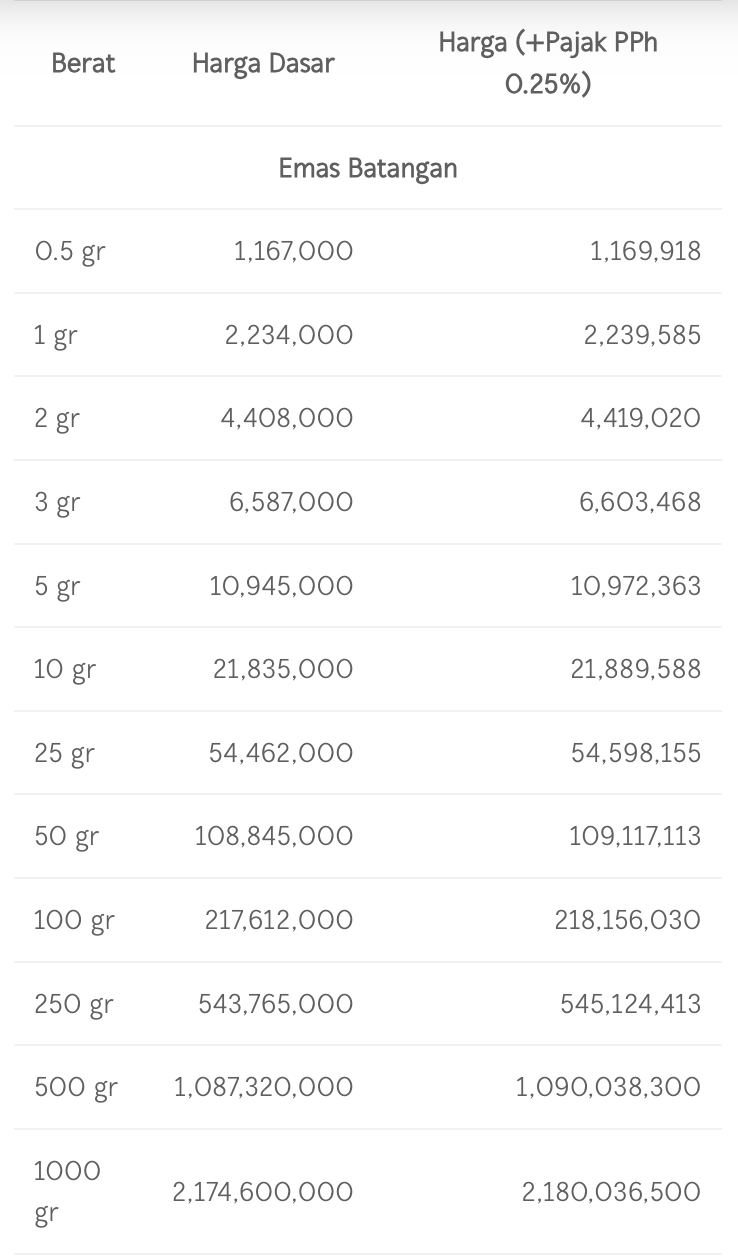 Berikut daftar harga emas Logam Mulia Antam selengkapnya untuk hari ini: