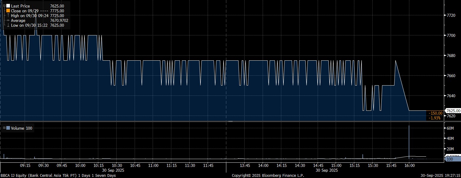Adapun investor asing net sell yang masif pada saham PT Bank Central Asia Tbk (BBCA) mencapai Rp382,31 miliar. Desakan arus jual yang begitu kuat, saham BBCA melemah 1,93% terpeleset di posisi Rp7.625/saham.
