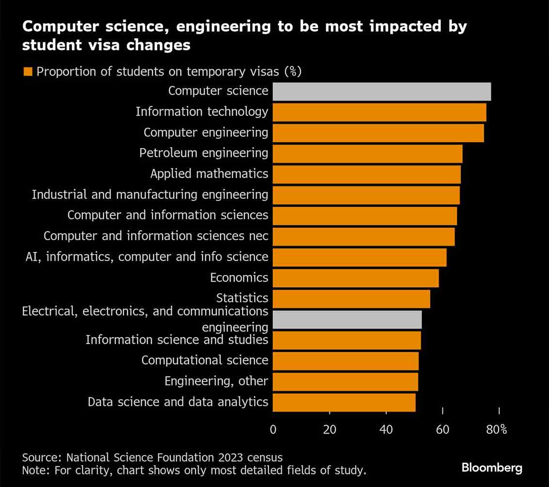 Ahli ilmu komputer dan teknik elektro — kepakaran yang populer bagi inovator semikonduktor masa depan — menampung proporsi tertinggi mahasiswa internasional di AS. Menurut survei 2023 oleh National Science Foundation, lebih dari tiga perempat mahasiswa pascasarjana ilmu komputer di AS dan lebih dari setengah mahasiswa teknik elektro adalah mahasiswa asing yang terdaftar dengan visa.