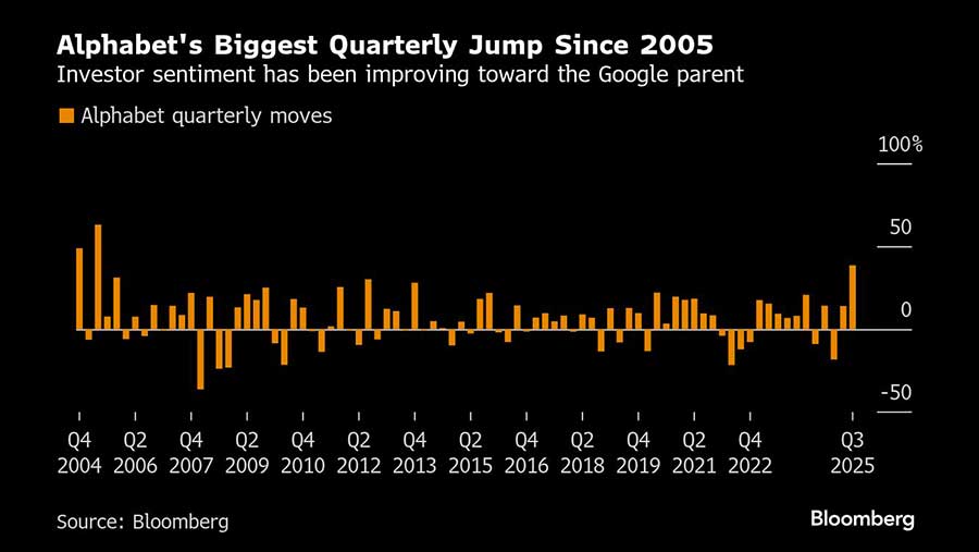 Bloomberg, Saham Alphabet Inc. mencatatkan kenaikan kuartalan terbesar dalam 20 tahun, mencerminkan semakin positifnya pandangan investor terhadap induk perusahaan Google berkat penguatan posisinya di bidang kecerdasan buatan.
