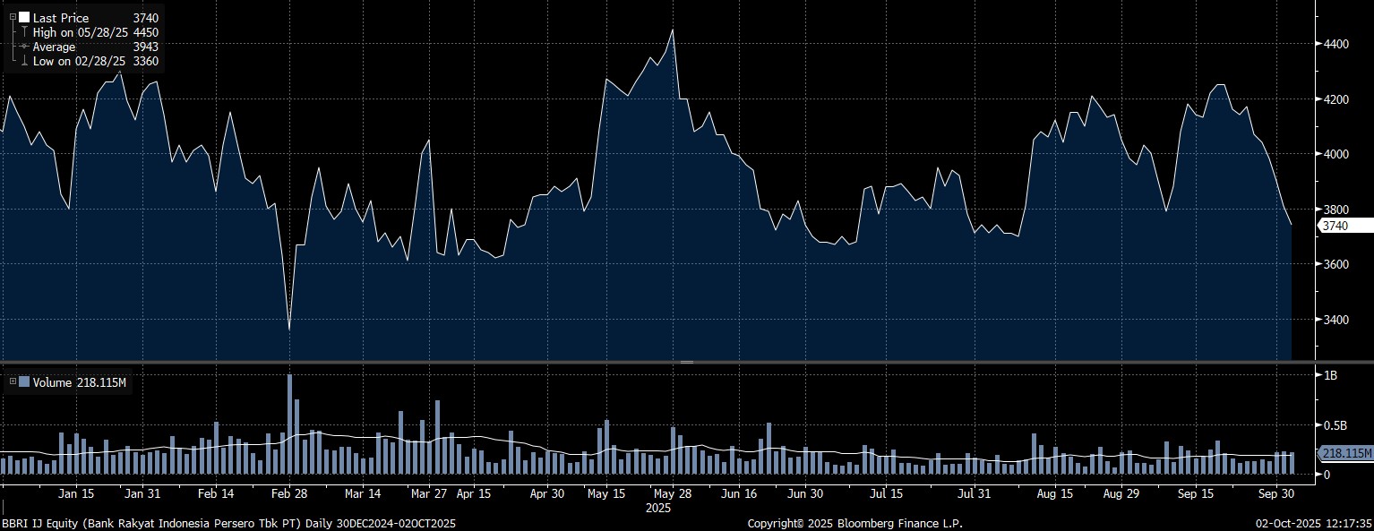 Analis Citi Ferry Wong mempertahankan rekomendasi buy pada Kamis (2/10/2025). Ia juga mempertahankan target harga saham BBRI di harga Rp5.300/saham.
